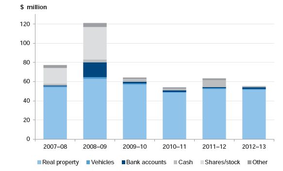 Shares make up a very small number of the forfeited assets that ACO deals with. While 15 share portfolios have been forfeited since 2007–08, apart from one significant year, the gross value of this asset class ranges from between $0 (in two years) to $200 000. Processes are in place to manage this asset, although they lack clarity around competitive procurement—particularly for portfolios in excess of $1 million.