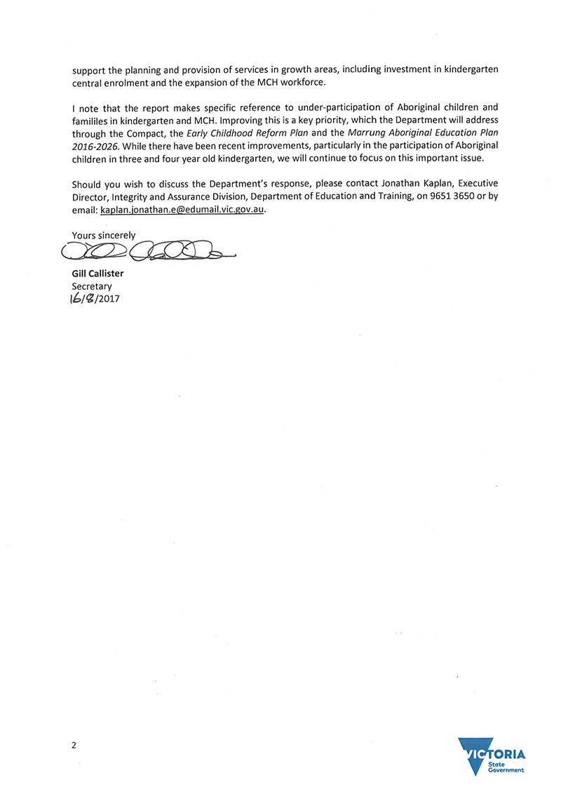 The collection of system-wide information on kindergarten attendance is another area of concern. The government lacks a sound understanding at the state and local levels of who is accessing kindergarten services and whether eligible children are missing out. As a result, the government is not fulfilling the objectives set out in its policy document Education State 2016, which states that kindergarten provision is at the heart of the government’s vision.